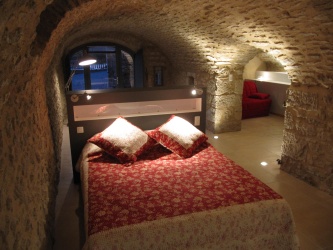 Présentation Avec ses pièces voutées, la suite d'hôtes est la chambre qui dégage le plus de charme et de caractère du Mas de la Tourelle. Très spacieuse, avec ses 60 m², elle bénéficie d'une chambre principale avec la voûte en pierre pour ciel de lit, d'une deuxième pièce voûtée, attenante, avec salon (canapé BZ, une télévision écran plat) et une banquette lit en fer forgé. Elle a un accès direct et de plain-pied avec la pièce à vivre. Ses portes-fenêtres donnent sur une terrasse privative qui dispose d'un salon de jardin, au pied de l'ancienne tourelle. Elle a une vue privilégiée sur l'espace piscine et le jardin d'agrément.